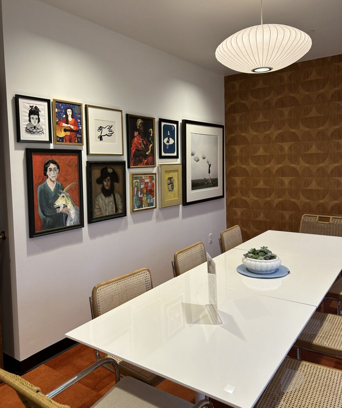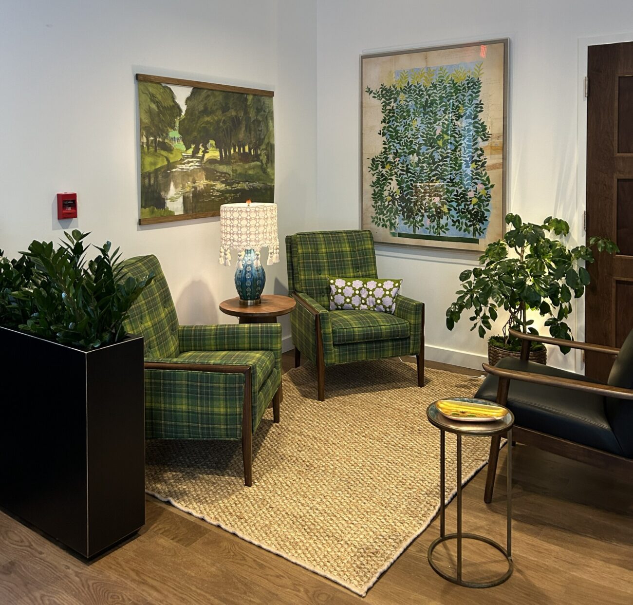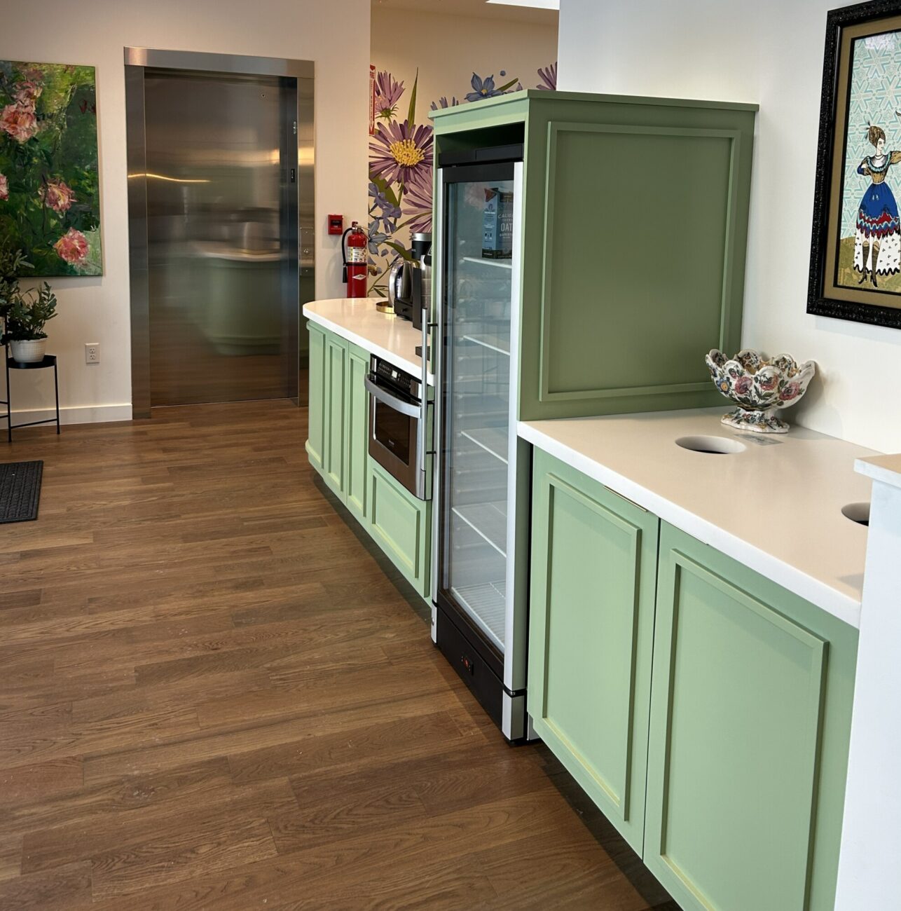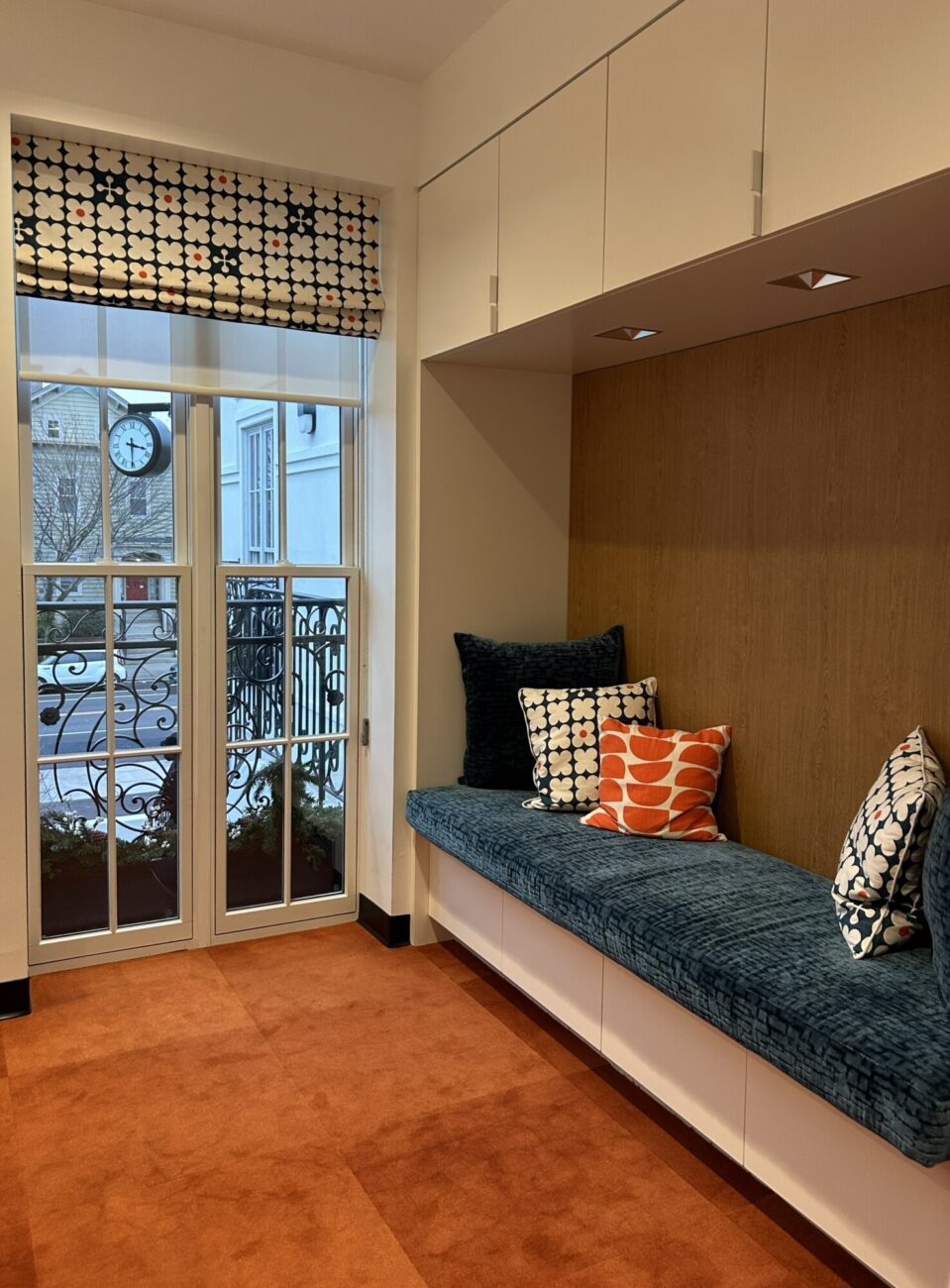 A quiet co-working space in an industrial building near the train tracks in Providence. The challenge was to provide different types of comfortable spaces and seating for writers, from extroverts who like a bit of noise to those who require silence and a studious environment. There is also a podcasting space which requires sound dampening and other acoustic conditions, as well as a Training Room, a Conference Room and two telephone rooms for zoom calls. We created a collection of rooms with good acoustic isolation from one another and quiet ventilation and air conditioning. Each space has a unique character using color, art, wallpaper and murals as well as custom cabinetry. The main space has a custom office for the organization’s managers, which features display shelving for local authors’ books. The “Quiet Car” (named in honor of the proximity to the Amtrak line) has custom writing nooks with shelving and sit-to-stand desks to allow flexibility in seating.