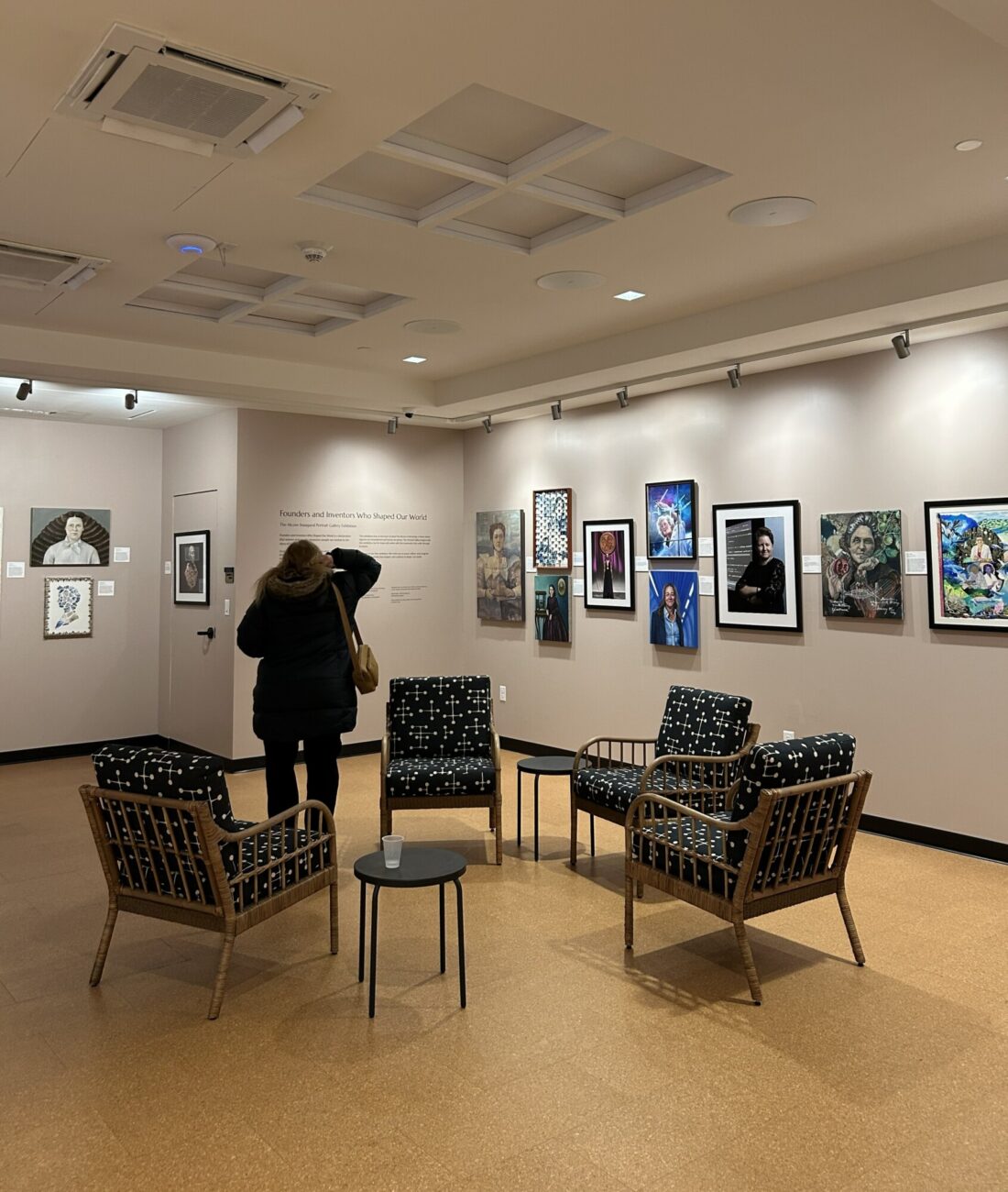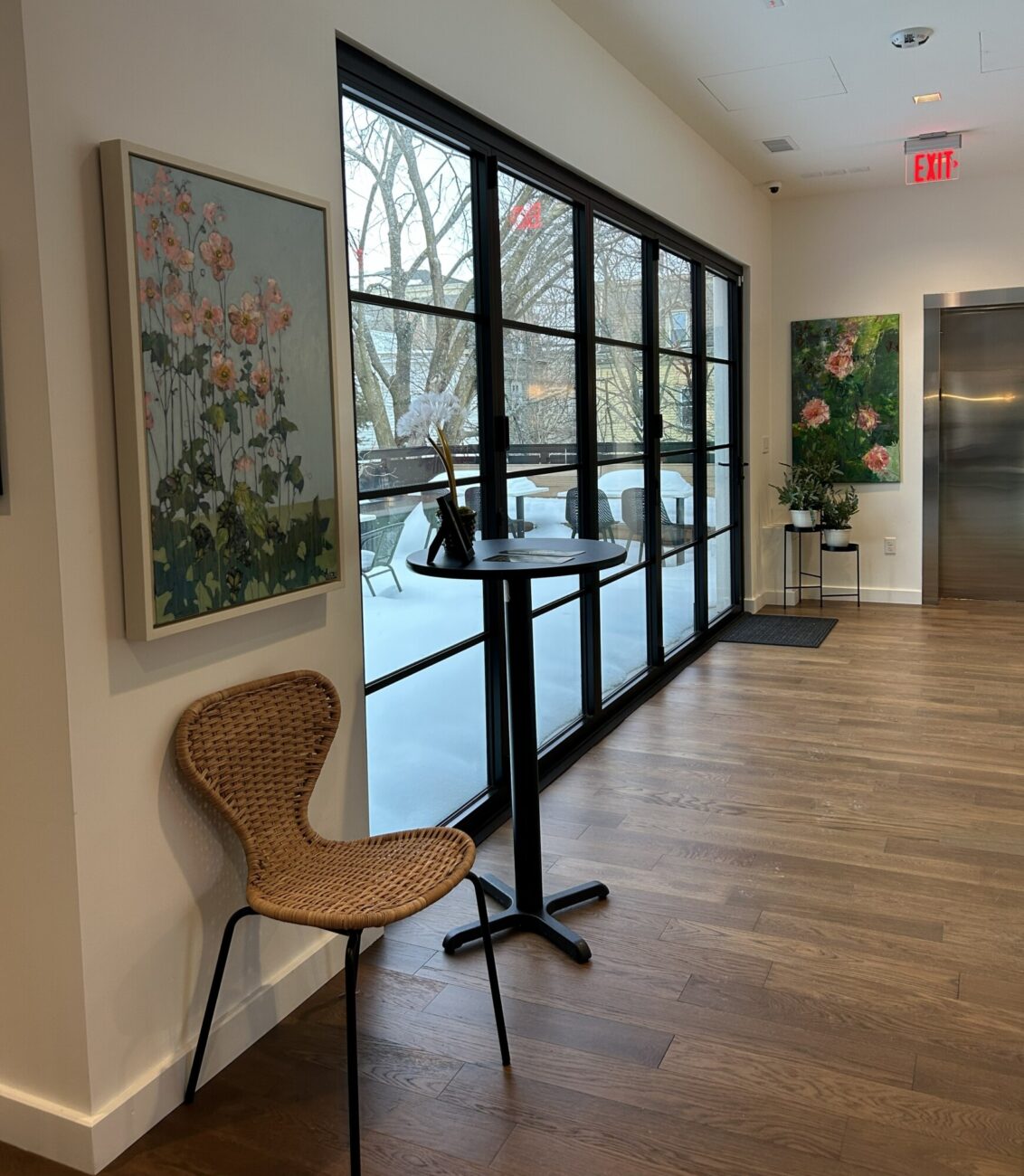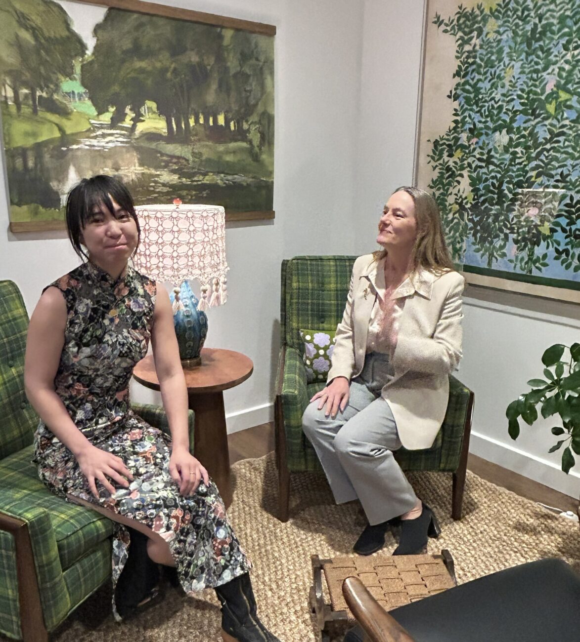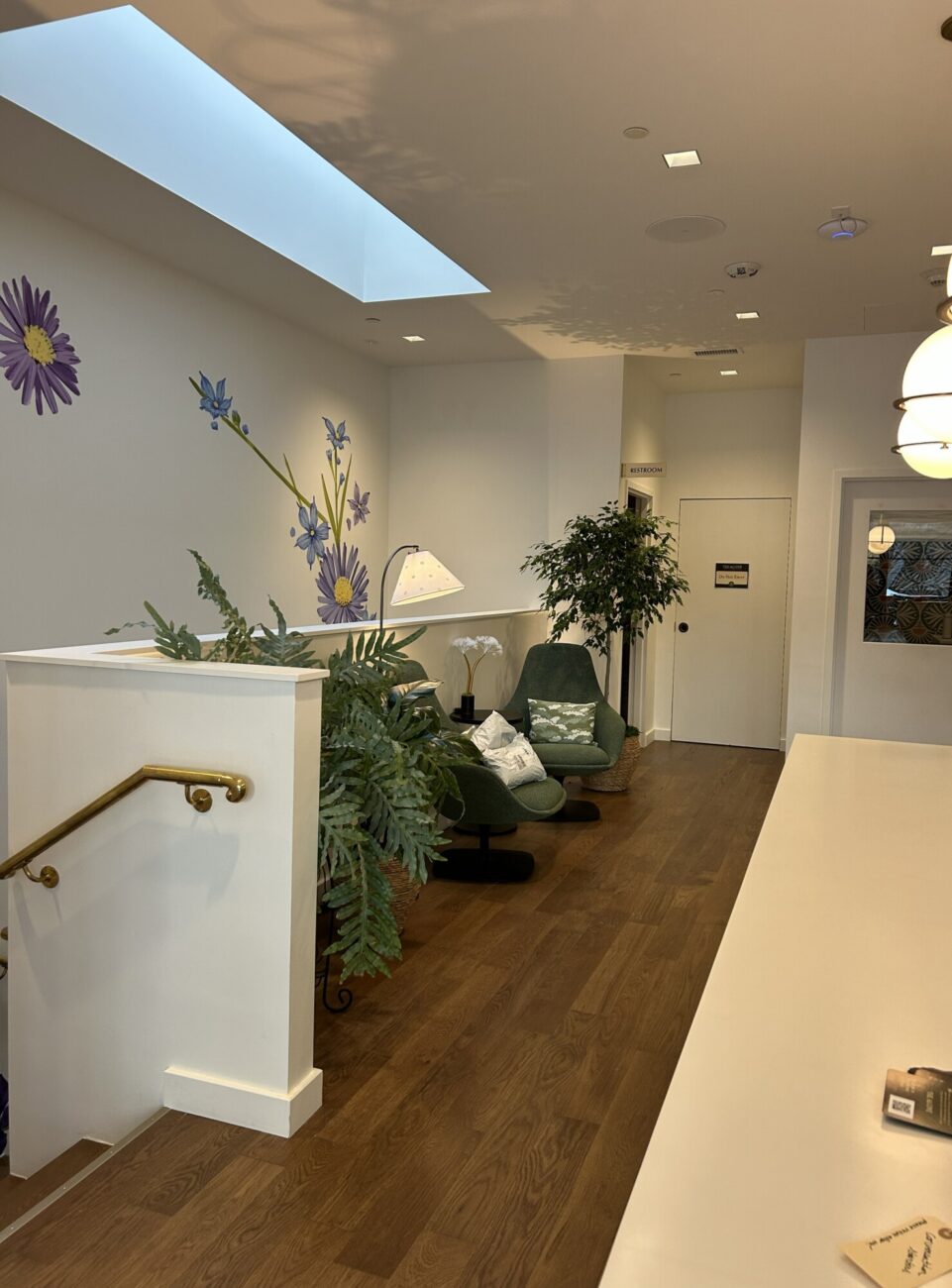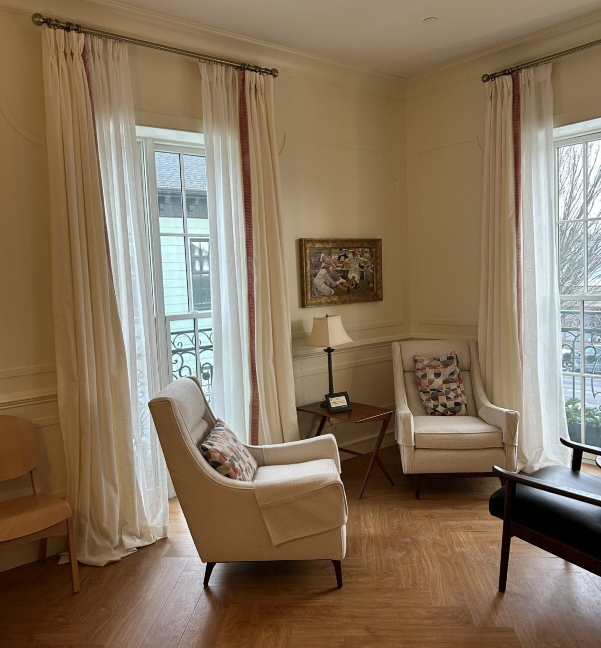 A quiet co-working space in an industrial building near the train tracks in Providence. The challenge was to provide different types of comfortable spaces and seating for writers, from extroverts who like a bit of noise to those who require silence and a studious environment. There is also a podcasting space which requires sound dampening and other acoustic conditions, as well as a Training Room, a Conference Room and two telephone rooms for zoom calls. We created a collection of rooms with good acoustic isolation from one another and quiet ventilation and air conditioning. Each space has a unique character using color, art, wallpaper and murals as well as custom cabinetry. The main space has a custom office for the organization’s managers, which features display shelving for local authors’ books. The “Quiet Car” (named in honor of the proximity to the Amtrak line) has custom writing nooks with shelving and sit-to-stand desks to allow flexibility in seating.